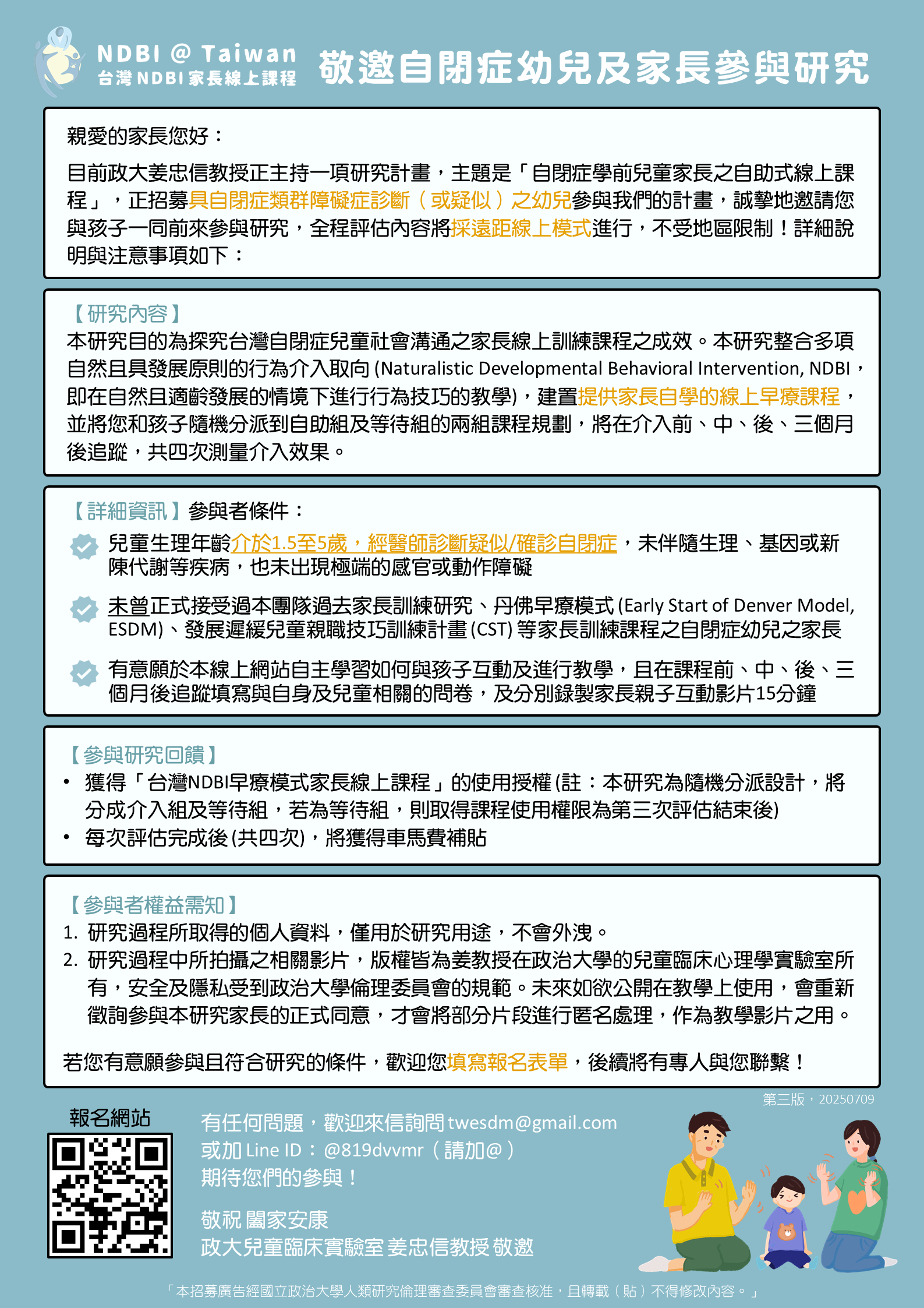 *有意願於本線上網站自主學習如何與孩子互動及進行教學,且在課程前、中、後、三個月後追蹤填寫與自身及兒童相關的問卷,及分別錄製家長親子互動影片15分鐘。